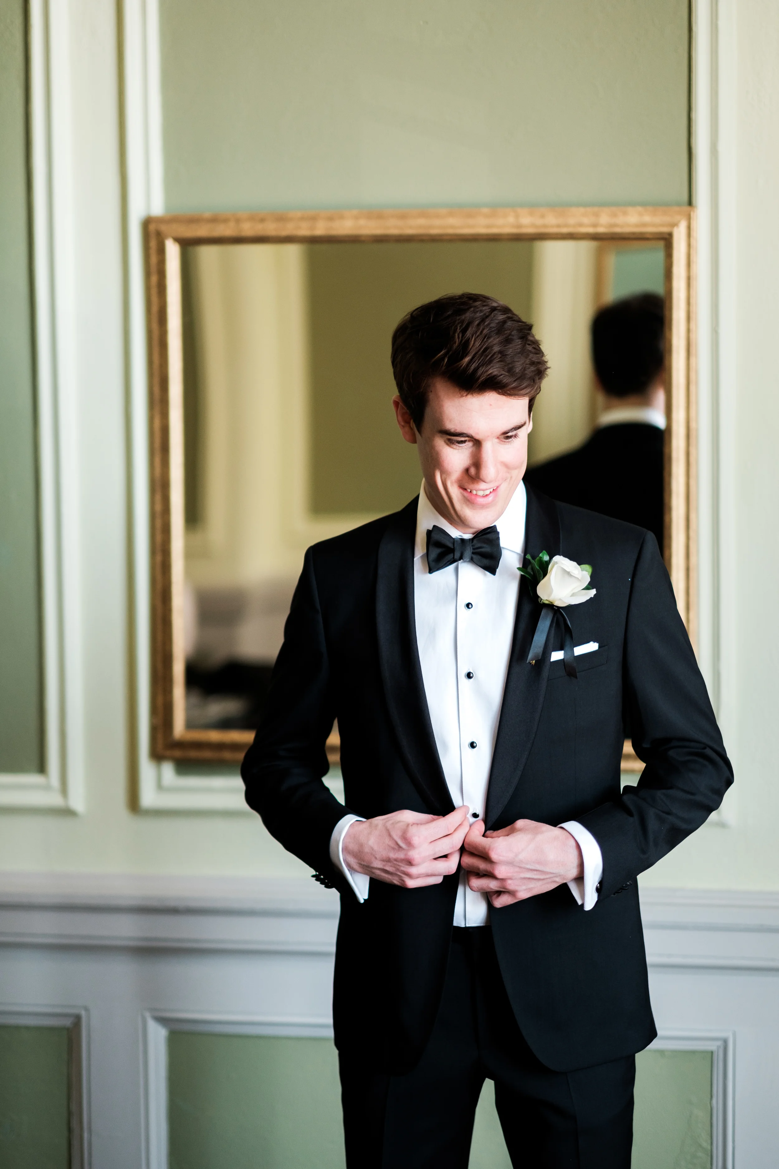 Groom getting ready in the lobby of the Saint Paul Hotel